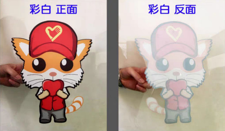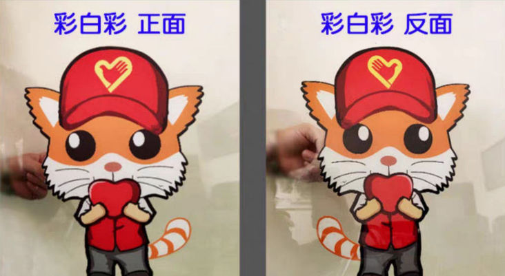 彩白是先打一層彩色再打一層白色,正面看過去是彩色的, 反面看是一層白色,貼在玻璃上,顏色不透明,飽和度高一些,不會因為材料是透明的使得顏色也是透明的,多為單面看。