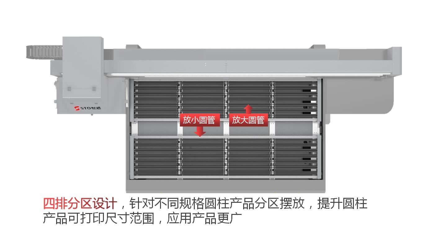 四排分區設計,針對不同規格圓柱產品分區擺放,提升圓柱產品可打印尺寸范圍,應用產品更廣。