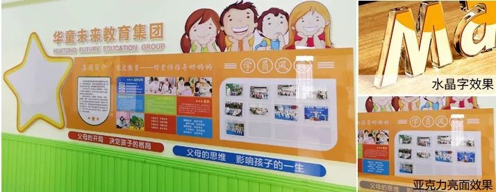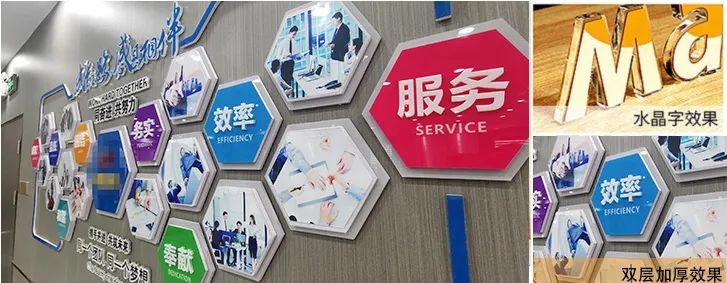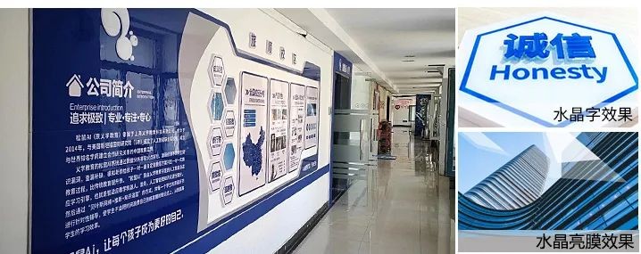 工藝:PVC覆鋼化貼、膚感貼再加異形包覆側(cè)噴、側(cè)面噴漆、熱熔封邊、鋼化無框折彎的工藝,配合磁性畫面、焗漆水晶字等最新工藝,將每個(gè)文化墻做成手工藝品。