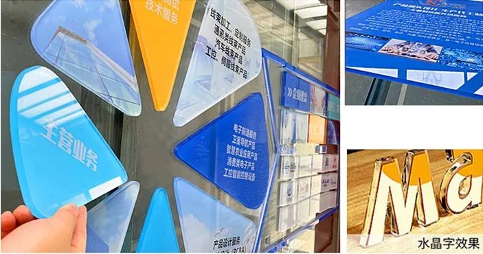 優(yōu)勢(shì):多層立體堆疊、玻璃光澤。 水晶廣告UV工藝—整體亞克力板制作