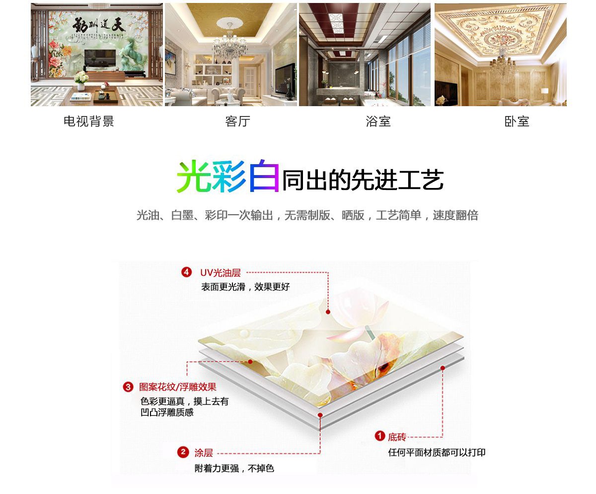 在裝飾行業UV打印機的作用也是同等重要。UV打印機不需要排版,只需要把需要打印的圖片轉到電腦軟件,即可進行打印工作,節省了時間與人力,UV打印機適用于背景墻、玻璃移門、瓷磚、地毯、幕墻、 隔斷 、天花板、木板、 有機玻璃板等平面材質的噴繪。摒棄傳統單一,運用個性構思、先進的打印工藝,滿足對藝術的所有渴望。