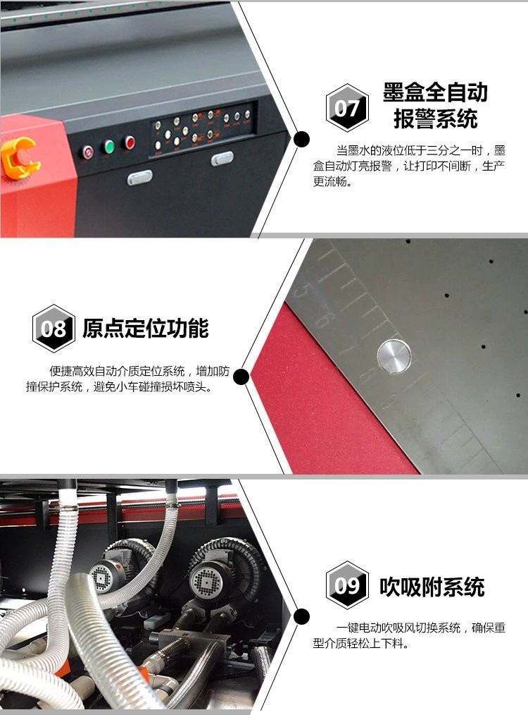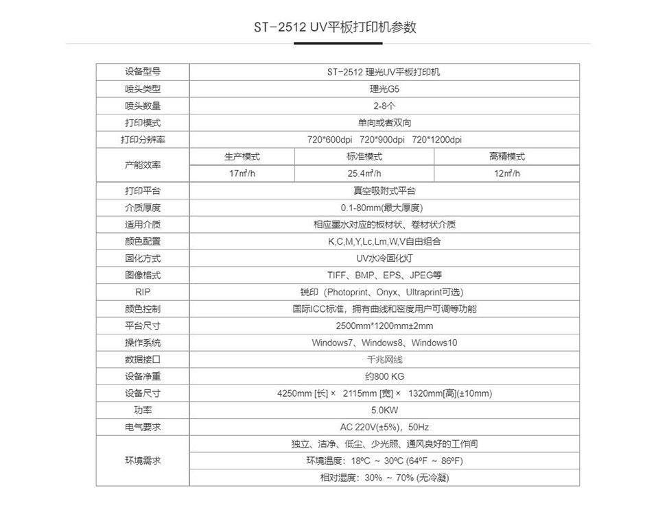 ST2512 UV平板打印機為世通中大型UV平板打印機,它廣泛運用在廣告UV打印行業、背景墻UV打印行業、藝術品uv打印行業、手機殼UV打印行業、包裝盒UV打印行業、玩具UV打印行業、家裝UV打印行業等所有行業及材料的平面UV打印;可打印尺寸2500MM*1200MM, 光彩白同步輸出的先進工藝,介質厚度在0.1-80MM。